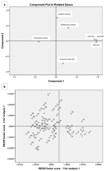 In our study, three eigenvalues had value higher than 1. The study of the contribution of variables to factors (Table 8) showed that Factor 1 (43.19% of variance) was related to five variables (acidification activity, survival to bile salts, survival to pH 21h, survival to pH 31h, survival to pH 33h), Factor 2 (18.515% of variance) was related to one variable (lipolytic activity), and Factor 3 (13.093% of variance) to one variable (proteolytic activity) (Figure 3a). A projection of the variables on the plane formed by the first two factors (Figure 3b) shows a clear relationship between the variables described above. However, they are quite scattered among them, but they can be distinguished mainly by three groups in which are close to each other. The first group is placed on the negative part of the two factors and involves isolates that do not combine proteolysis and lipolysis (or absence of both), having low resistance to pH but quite good resistance to bile salts (up to 75%), as well. Also, the majority of them are characterized as medium acidifiers. In the second group (negative of first factor and positive of second one), they are isolates with a greater resistance to pH and bile salts than the first group, and proteolytic and lypolitic activity are combined (both presence and absence). However, in this group microorganisms are characterized as slow and/or medium acidifiers. In the third group, which is placed on the positive side of factor 1 and negative of factor 2, there are isolates with high survival to pH (more than 75% in pH 3 after 3 h) and bile salts (up to 90%). Furthermore the majority of them are high acidifiers, but they do not have proteolytic and lypolytic activity. Apart from three main groups described above, there are also a few isolates separated from the rest. For example isolates 11 and 12 have medium resistance to pH but high resistance to bile salts (93% and 100% respectively). They are also a few low acidifiers but they have both proteolytic and lipolytic activity. Furthermore, another group of four isolates (1, 2, 3, 4) was characterized by high values of acidification, while they have high resistance to pH (average 74% to pH 2 and 84% to pH 3 after 3 h) and bile salts (100%, 97% 100%, and 94%, respectively). None of these isolates have proteolytic and lipolytic activity. Isolate 16 which is depicted a bit away from the others (on positive side of factor 1 and negative of factor 2) presents intermediate values for all the parameters. According to PCA analysis, we conclude to seven isolates (1, 2, 3, 4, 11, 12, 16) having possibly promising possibly promising technological and probiotic attributes, as described above.