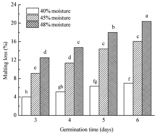 | Malting loss | 0.84 *** | 0.63 *** | 0.04 | −0.56 *** | 0.12 | 0.06 | 0.39 *** | −0.87 *** | −0.10 | −0.04 |