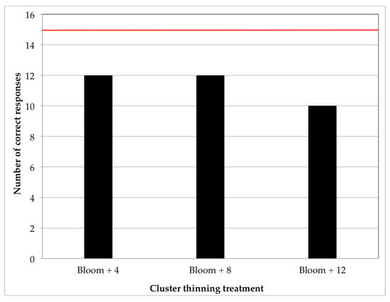 Results of the duo-trio test with constant reference performed in the 2016 wines. Each cluster thinning treatment was contrasted against the control treatment. A total of 15 correct responses were needed for a statistically distinguishable sensory difference (p < 0.05). The horizontal red line indicates the number of correct responses required to attain statistical significance.