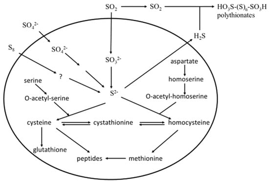 Sulfate assimilation pathway (SAP) in Saccharomyces cerevisiae. Top right: the formation of polythionates from the yeast metabolites H2S and SO2 ([], modified).