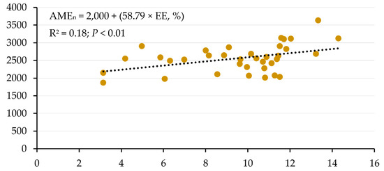 Linear regression of nitrogen-corrected apparent metabolizable energy (AMEn, kcal/kg, dry-matter basis) determined in broiler chickens on ether extract (EE) content (%, dry matter basis) of 36 samples of distillers dried grains with solubles. Data from Rochell et al. [13] and Meloche et al. [14,15].