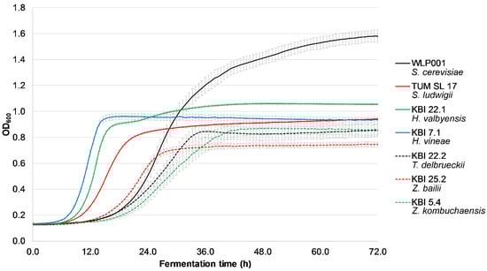 The second criterion for a yeast to be applied in brewing is its capability of growing in the presence of hop-derived iso-α-acids. The resistance against iso-a-acids and their induced weak organic acid stress were studied for the Saccharomyces species but it has barely been investigated for non-Saccharomyces species [28,29,30]. All investigated strains were able to grow in wort with 0, 50 and 100 IBU (international bitterness units). Figure 1 shows the exemplary growth of the investigated strains at 50 IBU (due to all strains exhibiting the same behavior at different IBU values, the rest of the data is not shown).
