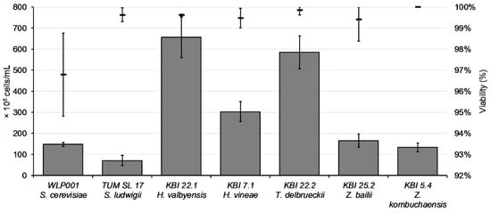 The aim of propagation is to get a high quantity of yeast cells with high viability and vitality. After propagation for 48 h, cell counts ranged from 7.1 × 107 cells/mL for TUM SL 17 to 6.5 × 108 cells/mL for KBI 22.1, as illustrated in Figure 2.