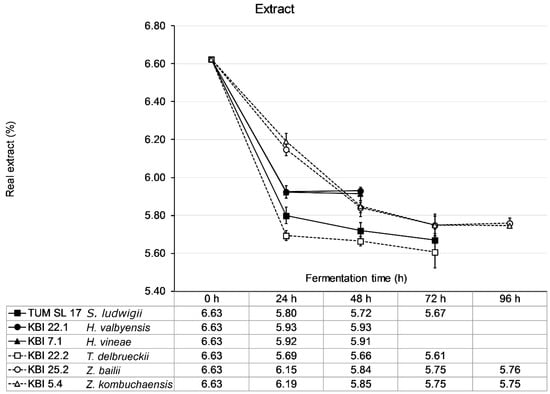 The wort was fermented until no change in extract was measurable for 24 h. KBI 22.2 showed the steepest decrease in extract with a drop in extract of nearly 1 °P extract in the first 24 h followed by TUM SL 17 (0.8 °P) and the Hanseniaspora spp. KBI 22.1 and KBI 7.1 (0.7 °P) (Figure 3). The Zygosaccharomyces spp., KBI 25.2 and KBI 5.4 followed a lesser decrease in extract with a linear decrease of about 0.45 °P per 24 h for the first 48 h. Consequently, KBI 22.2 reached an ethanol concentration of 0.42% (v/v) after 24 h, while KBI 25.2 and KBI 5.4 produced only 0.21% (v/v) and 0.20% (v/v), respectively. Fermentation ceased fastest for KBI 22.1 and KBI 7.1 after 24 h when fructose and glucose were depleted while sucrose remained untouched. TUM SL 17 and KBI 22.2 reached their final extract after 48 h of fermentation. KBI 25.2 and KBI 5.4, demonstrating the slowest metabolism, ceased fermentation after 72 h. WLP001 fermented the wort to a final extract (real) of 2.13 °P after 96 h (data not shown).