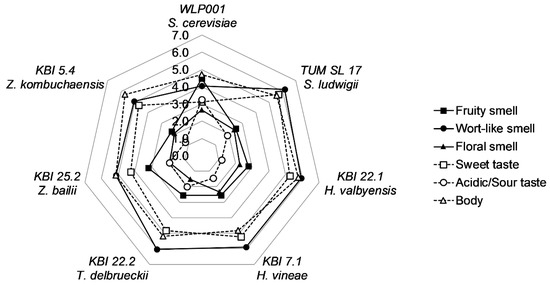 To evaluate and compare the flavor of the beers, a panel of 11 trained and experienced beer tasters judged the beers by individual description of the aroma, followed by the evaluation of the intensity descriptors “fruity”, “wort-like” and “floral” smell, “sweet” and “acidic/sour” taste, and the body of the beer. Each descriptor was given a value on a scale from 0 (nothing) to 10 (extremely). A spider web graph of the means for the descriptors is shown in Figure 4.