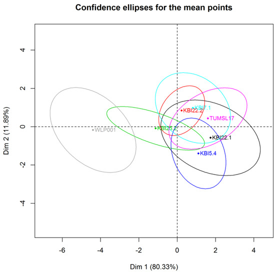 In the PCA graph (Figure 6), confidence ellipses (α = 0.05) around each beer were added to visualize the uncertainty as for the position of the beer given by the panel. Well separated confidence ellipses indicate a great discriminant power of the panel.