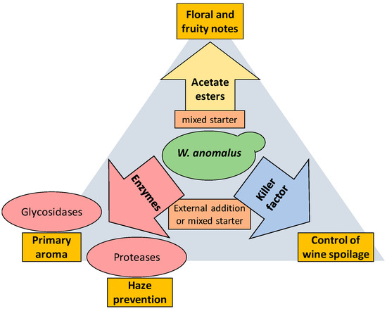 Wickerhamomyces anomalus, formerly known as Pichia anomala, Hansenula anomala, Candida pelliculosa was recently assigned to the genus Wickerhamomyces based on phylogenetic analysis of gene sequences, which has caused major changes in the classification of yeasts. [12]. This species has been frequently isolated from grapes and wines. Although traditionally W. anomalus is associated with excessive production of ethyl acetate, which represents a serious handicap for their use in winemaking, this species has gained considerable importance for the wine industry since it exhibits interesting and potentially exploitable physiological and metabolic characteristics as summarized in Figure 1. Here, we revisit the contribution of W. anomalus in wine production. First, we review the ecology and prevalence of this yeast in winemaking, and we discuss its ability to produce enzymes, killer toxins, and metabolites of enological relevance. Second, we review the design of mixed starters of W. anomalus with S. cerevisiae to improve wine aroma complexity. Finally, we discuss biotechnological applications of W. anomalus beyond wine fermentation. When citing older literature, the original yeast species name will be kept.