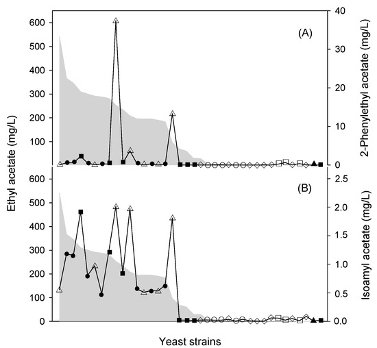 Production of acetate esters by non-Saccharomyces yeast strains. (A) 2-Phenylethyl acetate (symbols; right axis). (B) Isoamyl acetate (symbols; right axis). Ethyl acetate is represented in both panels as an area plot (left axis). Strains: ● Pichia anomala (seven different strains), ■ P. membranifaciens (seven different strains), ▲ P. fermentans (one strain), ◇ Candida spp., △ Hanseniaspora spp., ◯ Torulaspora spp., □ Zygosaccharomyces spp. Adapted from Reference [59].