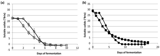 Soluble solid levels during fermentation. (a) The 23°Brix control must was inoculated with EC1118 (○) and CN1 (□); (b) the 28°Brix partially dehydrated grape must was inoculated with EC1118 (●) and CN1 (■). Data represents the mean value ± standard deviation of duplicate measurements per sample (three winemaking replicates per treatment).