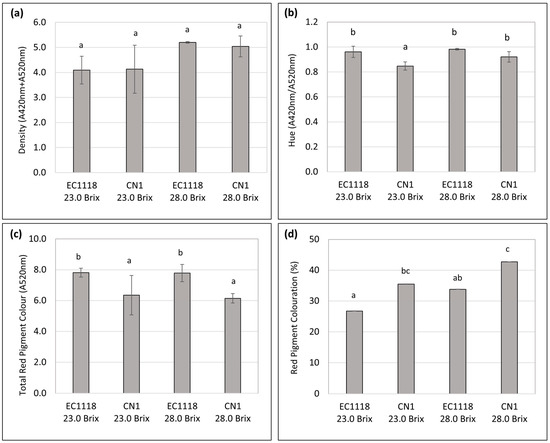 (a) Wine color density (b) wine hue, (c) total red pigment color (anthocyanins, oligomers, and polymers) and (d) degree of red pigment coloration (%) of control wines (23°Brix) and wines made from partially dehydrated grapes (28°Brix) vinified with either EC1118 or CN1. Data represents the mean value ± standard deviation of duplicate measurements per sample (three winemaking replicates per treatment). Lowercase letters indicate differences between treatments (Fisher’s Protected LSD0.05).