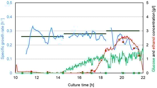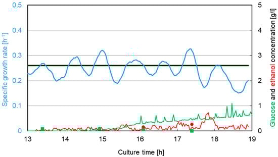 By maintaining the specific growth rate at a setpoint below the critical value, the overflow metabolism was effectively avoided. Noise in the estimated values of μ and the measurement lag caused by the moving-average filtering remained problematic from the control point of view. As can be seen in Figure 2, the specific growth rate briefly exceeded 0.30 h−1 at the culture time of 15 h and shortly after 17 h, provoking a slight increase in ethanol concentration, which, in turn, resulted in a subsequent drop in the measured μ and a minor accumulation of residual glucose.