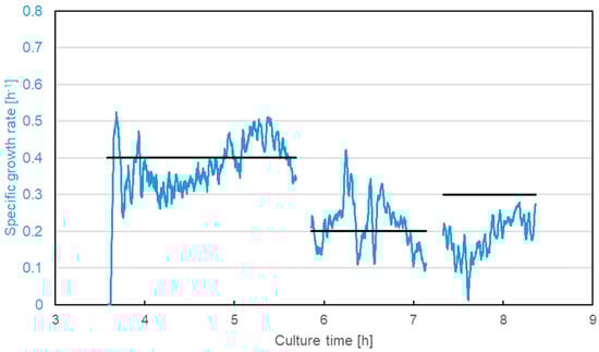 Specific growth rate of E. coli (B strain) during the fed-batch culture phase. Three μ setpoint values were tested: 0.40, 0.20, and 0.30 h−1.
