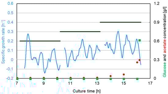 Specific growth rate of E. coli (K-12 strain) controlled with the feedforward controller during the fed-batch culture phase. Three setpoint values of the specific growth rate were applied: 0.20, 0.30, and 0.40 h−1. The concentration of glucose and acetate, measured by HPLC enzymatic analysis, respectively, is shown with dots.