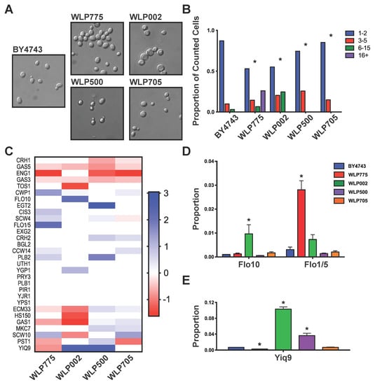 Yeast flocculation and cell wall proteome. (A) Microscopy images of the five yeast strains (400x magnification); (B) flocculation extent of each strain. * p < 0.01 with comparison to BY4743; (C) heat map of significantly differentially abundant proteins (p < 10−5) between designated yeast strain and BY4743. Values shown as log2(fold change); (D) abundance of Flo1/5 and Flo10 in the cell wall; (E) abundance of YIQ9 in the cell wall. Values, mean. Error bars, SEM. * p < 10−5 with comparison to BY4743.