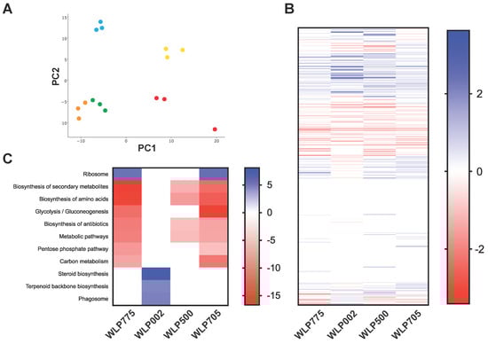 Whole cell proteome comparison between yeast strains. (A) Principle component analysis of whole cell proteome. Colored by yeast strain: BY4743 (red), WLP775 (green), WLP002 (yellow), WLP500 (blue) and WLP705 (orange). The first component (x-axis) accounted for 25.86% of the total variance and the second component accounted for an additional 20.51%; (B) heat map of differentially abundant proteins between designated yeast strains and laboratory BY4743. Values shown as log2(fold change) for proteins which were significantly different in abundance (p < 10−5) between each yeast strain and BY4743; (C) heat map of significantly enriched pathways identified by DAVID analysis. Values shown as −log2 of Benjamini corrected p-values for pathways which were significantly enriched (p < 0.05).