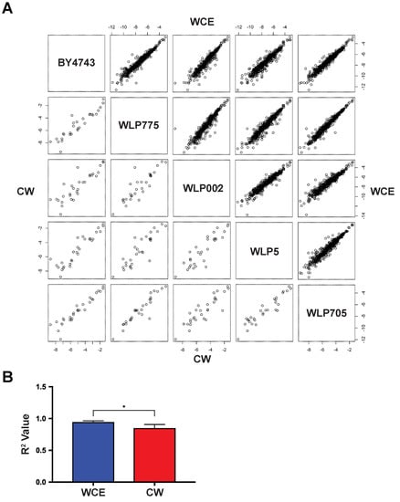 Pairwise comparison of yeast cell wall and whole cell proteomes. (A) Pairwise scatter plots of the natural logarithm normalized mean relative abundance for identified proteins between all strains. Cell wall proteome (n = 30) data are in the bottom left plots, while whole cell proteome (n = 468) data are in the top right plots; (B) R2 correlation plot. Error bars, SD. * p < 0.001.