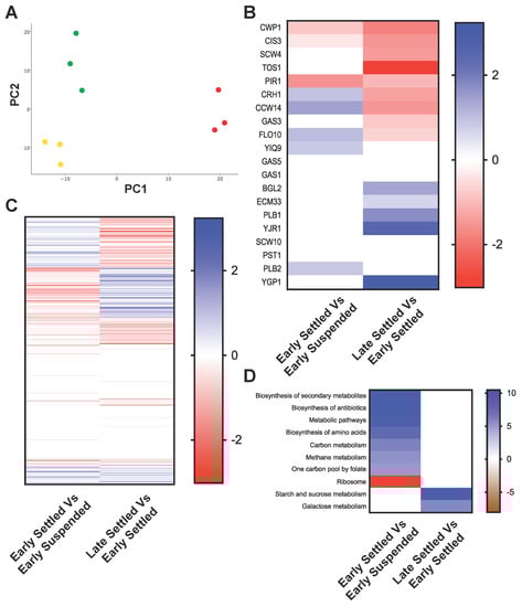 Proteomic comparison of English ale WLP002 across the course of fermentation. (A) Principle component analysis of whole cell proteome. Colored by stage of fermentation: Early Suspended (yellow), early settled (green) and late settled (red). The first component (x-axis) accounted for 37.56% of the total variance and the second component accounted for an additional 20.25%; (B) heat map of cell wall proteins that are different in WLP002: early settled cells compared to early suspended cells, and late settled cells compared to early settled cells; (C) heat map of whole cell proteins that are different in WLP002: Early settled cells compared to early suspended cells, and late settled cells compared to early settled cells. Values in heat map (A,B) are shown as log2(fold change) for proteins with significantly different abundances (p < 10−5) in the relevant comparisons; (D) heat map of significantly enriched pathways identified by DAVID analysis. Values shown as −log2 of Benjamini corrected p-value for pathways which were significantly enriched (p < 0.05).