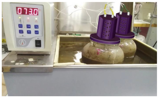 The treated and untreated grains were milled separately using a coffee grinder (Sinbo SCM-2929, Istanbul, Turkey). Milled grain (500 g) was measured and transferred into hand-made mash tuns filled with 1.25 L of warm water (45 °C). The mixture was then placed in a water bath equipped with temperature regulators and a heating system (Figure 1). Enzyme preparation was then done by adding α-amylase (2.5 unit/1 g of starch) and Xylanase (1 unit/1 g of grains), in warm water (45 °C), to the mixture (Erbslöh, Geisenheim, Germany). The ratio of grains to water was 1:2.5. The temperature of the mash was then increased to 50 °C for 30 min followed by 70 °C with a rest time of 4 h.