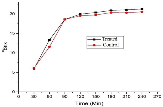 At the end of the mashing, the treated mash had slightly higher (21.267 ± 0.058) °Brix when compared to the control (20.533 ± 0.115). This could be attributed to the fact that the HS might slow the rate of the exogenous enzyme on the treated grains. According to Brigg et al. [32], 90–92% of the solids in the brewing wort are carbohydrates, which consist of sucrose, fructose, glucose, maltose, maltotriose, as well as dextrin. Moreover, 95% of those carbohydrates are products of the starch hydrolysis, which takes place in the mash tun.