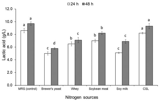 Lactic acid production from various nitrogen sources using L. plantarum S21 under static conditions at 37 °C for 24 h (white column) and 48 h (gray column).