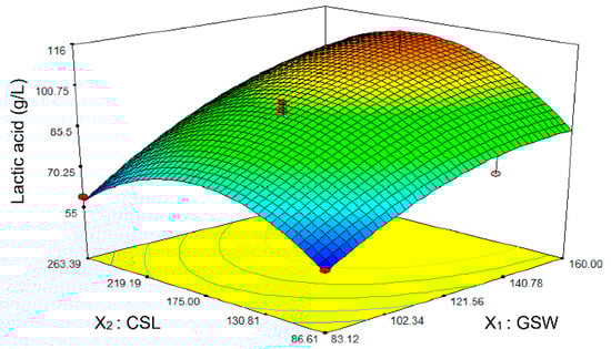 In order to display the results visually, a three-dimensional surface response plot was generated, to indicate the interactions of GSW and CSL (Figure 2). A predicted highest lactic acid production of 105.6 g/L could be obtained at a concentration 134.4 g/L GSW and 187.7 g/L CSL. To verify the predicted results, an experiment was performed under optimized nutrient levels, and the experimental lactic acid production was found to be 102 g/L, suggesting that the experimental and predicted values were in good agreement.