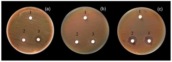 Antimicrobial activity of cell-free culture supernatant (CFCS) obtained from L. plantarum S21 cultivation in the optimized medium at 37 °C for 48 h against E. coli ATCC 25922 (a), S. enterica serovar Typhimurium TISTR 292 (b), V. cholerae TH-001 (c); deionized water (1), neutralized CFCS (2), and non-neutralized CFCS (3).