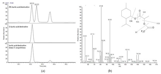 (a) The GC/MS of O-trifluoracetyl-(–)-menthyl derivatives of DL-Lactic acid, L-lactic acid and natural lactic acid from T. neapolitana. Chromatograms show L-lactic and D-lactic acid derivatives at Rt of 10.21 min and 10.25 min, respectively; (b) mass spectrum and diagnostic fragmentations of the O-trifluoroacetyl-(−)-menthyl ester of lactic acid.