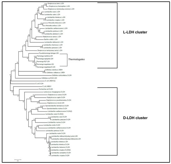 Sequences of lactate dehydrogenase (LDH) from different bacteria representing genera (Lactobacillus, Streptococcus, Staphylococcus, Sulfolobus, Escherichia and others) were found using keywords and BLAST searches on UniProt database. Lactate dehydrogenase of Thermotogales were obtained on the Ensamble bacteria database (https://bacteria.ensembl.org/index.html) (access on December 2018). using a BLASTp approach. Alignments and phylogenetic analyses were performed using the software MEGA version 6 [14]. Sequences alignment was achieved using the MUSCLE algorithm, using a maximum number of interaction equal to 32. Phylogenetic tree was constructed using the maximum likelihood method with the substitution LG+I model gamma distributed. The test of phylogeny was performed using the bootstrap method with the number of replication equal to 100.
