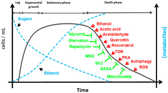 - Burtner, C.R.; Murakami, C.J.; Kennedy, B.K.; Kaeberlein, M. A molecular mechanism of chronological aging in yeast. Cell Cycle 2009, 8, 1256–1270. [Google Scholar] [CrossRef]