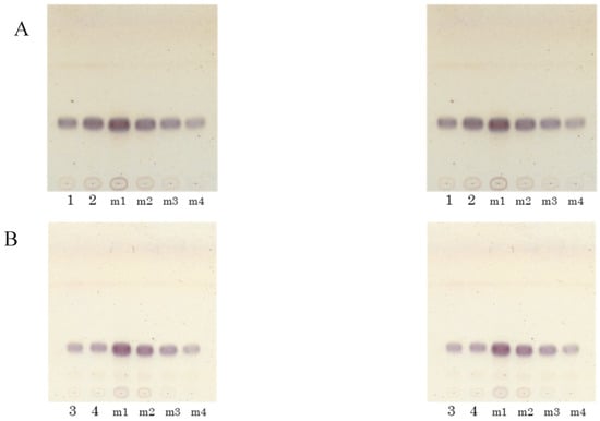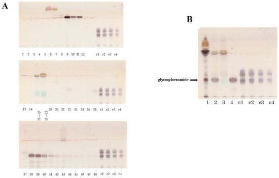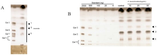 These lipid solutions containing glycosylceramides were spotted onto a TLC plate. Cerebroside derived from bovine brain was spotted as a control. A chloroform–methanol–acetic acid–water solution (20:3.5:2.3:0.7, v/v) was used as the solvent to develop the TLC plate. A part of the TLC plate was heated at 100 °C for 40 min. The rest of the TLC plate was scratched and collected according to the location of the detected glycosylceramides. The silica gel was eluted with 6 mL of a chloroform–methanol solution (2:1, v/v), and the collected sample was dried in an evaporator and dissolved in 1 mL of chloroform.