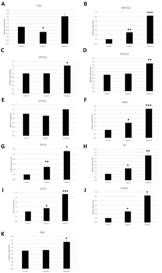 2.4. Analysis of the Expression Levels of Genes Involved in Skin Barrier Function