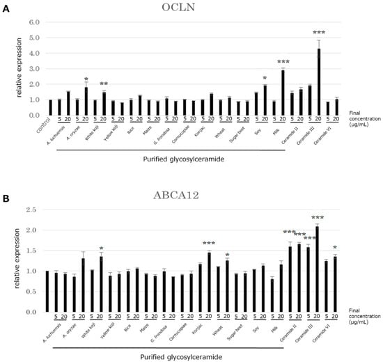Sphingolipids derived from other sources exhibited effects on the gene expression of OCLN and ABCA12. Other than the glycosylceramide from white