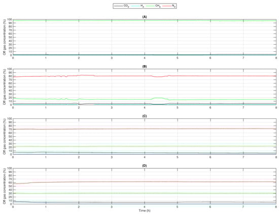 The obtained parameters, pH, oxidation reduction potential (ORP), temperature, and pressure, which were observed and are not presented in this section, did not differ from a normal methanation process using just carbon dioxide and hydrogen as feed gases. All experiments were performed 4 to 6 times with the same results. For each experiment, a typical result was considered.