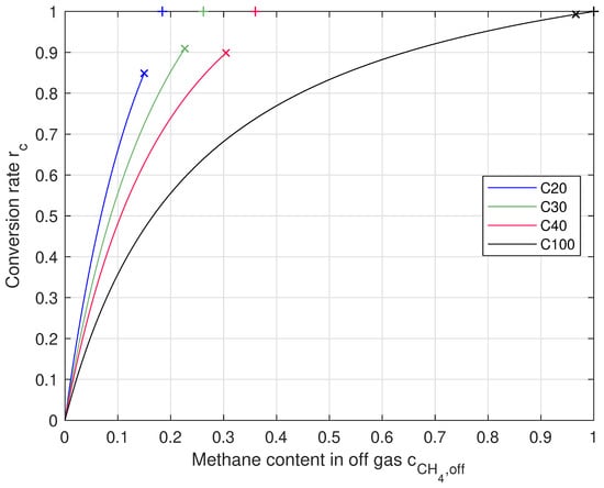 When reaching a full conversion, which means and no and left, the off-gas only consisted of for C20 and C30, for C40, and just when using C100. This means that the off-gas must show the same composition as the carbon-dioxide-containing feed gas, but is fully replaced by . In every experiment, was close to its mole fraction in the mixed gas (without ). It can also be seen that the concentration of in the off-gas was always close to 1% and therefore, was almost fully converted to methane. The carbon dioxide concentration was 3.9% to 5.4% when feeding /, so there was carbon dioxide left in the off-gas that could be converted. There was also a difference between and . Volumetric flows were calculated and not measured.