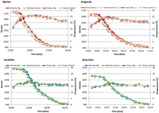 The influence of M. pulcherrima on the fermentation evolution and wine’s characteristics was evaluated. The fermentation progress, represented by temperature and density over time, for two red wine varieties, Merlot and Aragonês, and two white varieties, Alvarinho and Verdelho, are shown in Figure 1 as example. For the duplicate assays with the red grapevine varieties Touriga Nacional, Aragonês and Syrah almost overlapping curves were observed, as is shown for Aragonês (Figure 1). Curves of temperature and density pointed out the one day delay of the addition of Saccharomyces cerevisiae, as fermentation started earlier in the control, showing along the fermentation lower density, but eventually, at the end of fermentation, both modalities attained similar density values. All other fermentation curves showed similar behavior to the ones presented here (results not shown).