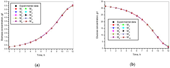 The rank of the models for the specific growth rate from glucose µ(S) is unknown, so the study investigated ten unstructured models (Table 1): M1 = Monod, M2 = Mink, M3 = Tessier, M4 = Moser, M5 = Aiba, M6 = Andrews, M7 = Haldane, M8 = Luong, M9 = Edward, and M10 = Han-Levenspiel [19,20,21,22,23,24].