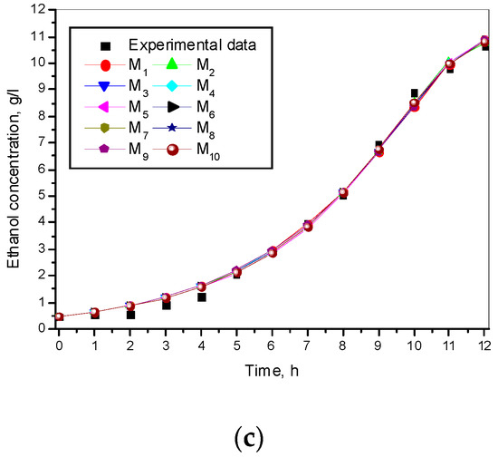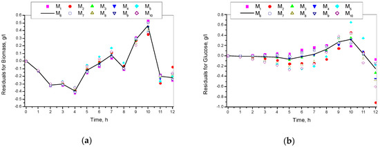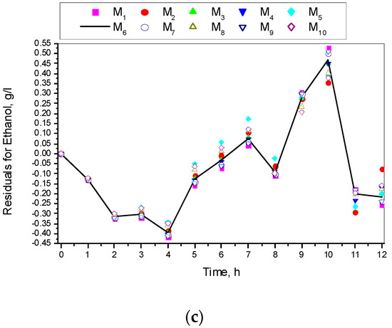 Residuals for models M1–M10: (a) Residuals for biomass concentration; (b) Residuals for glucose concentration; (c) Residuals for ethanol concentration.