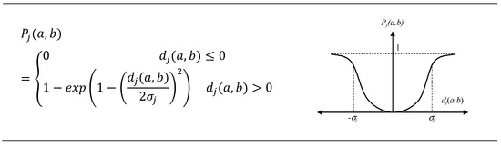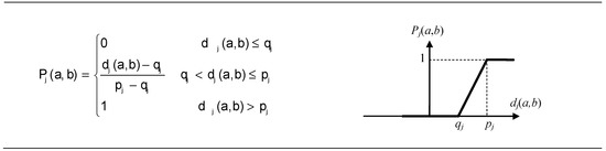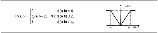 where Pj(a, b) denoted the preference of alternative a with regard to alternative b on each criterion, as a function of dj(a, b).