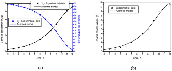 The results presented in Figure 7 show that the Andrews model described the experimental data very well. This is especially true for the simulation of the biomass and glucose concentration. In regard to ethanol, there were very few differences.