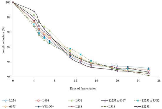 The fermentation kinetic data indicate that the greatest reduction in weight (%) were recorded for the L288, L318, and 12233 strains (Figure 1) which, at the end of fermentation, recorded the highest alcoholic degrees but not the lowest sugar residues (Table 2).