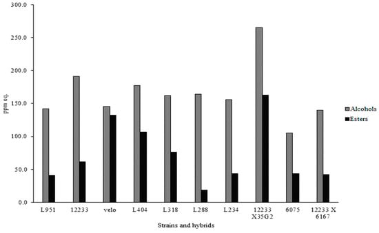 The effects of the considered strains on the volatile molecular profiles of Trebbiano samples were analyzed by gas-chromatography combined with mass spectrometry and solid phase micro extraction (SPME). About 60–65 molecules belonging to different classes of compounds, such as alcohols, aldehydes, ketones, acids, and esters were detected. In Figure 2, the equivalent ppm of alcohols and esters are reported. The strain 12233x35G2 produced the highest amount of alcohols (over 250 e-ppm) and esters (150 e-ppm). In particular, among alcohols, although in different amounts, 2 methyl propanol, 3 methyl 1 butanol, butanol, nonanol, 3 methyl pentanol, 3 etoxi propanol, (Z)-3-hexen-1-ol, 2 ethyl hexanol, (3S)-3,7-Dimethyl-6-octen-1-ol, hexanol, heptanol, phenethyl alcohol, and octanol were found. Regarding esters, butanol 3 methyl acetate, ethyl acetate, butanoic acid ethyl ester, hydroxy butyl ethyl ester, hexanoic acid ethyl ester, heptanoic acid ethyl ester, octanoic acid ethyl ester, decanoic acid ethyl ester, benzenacetic acid ethyl ester, and acetic acid 2 phenyl ethyl ester were detected.