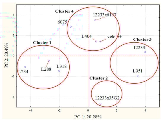 To highlight differences among the samples, a principal component analysis (PCA) was carried out taking into consideration all the molecules detected since the final wine volatile aroma profile is the result of the interaction of different molecules. PCA mapped wine samples in the space described by the first two principal component PC1 versus PC2 (Figure 3 and Figure 4). PC1 accounted the 20.28% of the total variability, while the PC2 for the 20.48%. Figure 3 describes the projection of samples in the space and the clusterization of the samples. On the basis of PCA analysis, samples were clustered into 4 different groups and were divided along the PC1 and PC2. Cluster 1 obtained from S. cerevisiae L 288, L 234, and L 318 strains was separated from other groups both along PC1 and PC2 as well as the Cluster 2 formed by the wine volatile profiles from the S. cerevisiae 12233×35G2 hybrid. Cluster 3 grouped samples from S. cerevisiae 12233 and S. bayanus L 951 strains. Cluster 4 was formed by S. cerevisiae strains L 404, velo 5+, 12233x6167 and 6075 samples (Figure 3).