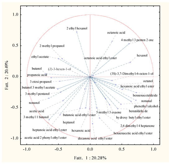 Principal component analysis loading plot of volatile molecular profiles of Trebbiano wines after 26 days of fermentation at 15 °C in relation to the fermenting agent considered.
