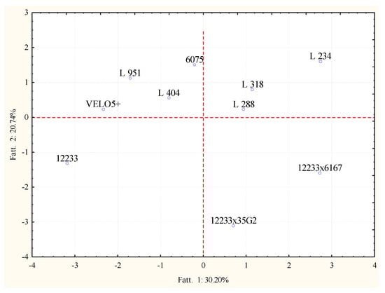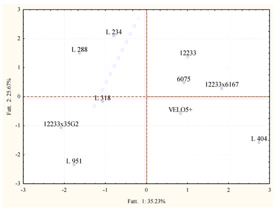 The projection of the variables which affected the clusterization is reported in Figure 4. In particular, cluster 1 was affected by butanol, propanoic acid, 3 ethoxy propanol, 3 methyl butanol, nonanol; for the second group mainly ethyl or methyl esters like heptanoic acid ethyl ester, acetic acid 2 phenyl ethyl ester, decanoic acid ethyl ester, and benzenacetic acid ethyl ester affected the clusterization. The third cluster differed for a greater production of benzenacetaldehyde, octanol, hexanol and hexanoic acid ethyl ester; while 2-ethyl hexanol, octanoic acid, 4-methyl-3-penten-2-one contributed to the grouping of samples 6075, 12233x6167, velo 5+ and L404 in cluster 4.