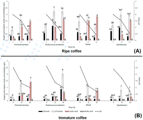 Pulp sugar consumption, organic acid production, and pH monitoring of inoculated (pure culture with Pichia fermentans, pure culture with Pediococcus acidilactici, and combined fermentation with P. fermentans and P. acidilactici) and spontaneous fermentation of ripe (A) and immature (B) coffee fruits. The significance of the results was assessed using an ANOVA with Duncan’s post-hoc test at p < 0.05. Different lowercase letters (a, b, c, d, e, f) indicate significant differences within the same process (ripe and immature coffee beans) over fermentation time.
