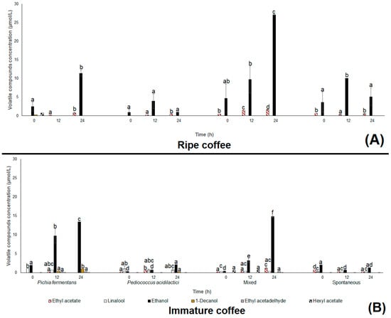 Concentration of volatile compounds produced in the course inoculated (pure culture with P. fermentans, pure culture with P. acidilactici, and combined fermentation with P. fermentans and P. acidilactici) and spontaneous fermentation of ripe (A) and immature (B) coffee fruits. The significance of the results was assessed using an ANOVA with Duncan’s post-hoc test at p < 0.05. Different lowercase letters (a, b, c, d, e, f) indicate significant differences within the same process (ripe and immature coffee beans) over fermentation time.