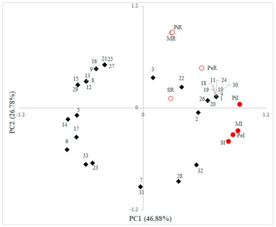 Principal component analysis (PCA) of volatile compounds (lozenges) identified in the different treatments of ripe (open circles) and immature (closed circles) coffee beans. Abbreviations: SR—spontaneous, ripe control; PiR—Pichia inoculation in ripe coffee beans; PeR—Pediococcus inoculation in ripe coffee beans; MR—mixed (Pichia plus Pediococcus) inoculation in ripe coffee beans; SI—spontaneous, immature control; PiI—Pichia inoculation in immature coffee beans; PeI—Pediococcus inoculation in immature coffee beans; MI—mixed (Pichia plus Pediococcus) inoculation in immature coffee beans. 1—butanoic acid, 3-methyl; 2—butanoic acid, 2-methyl; 3—hexanoic acid; 4—1-hexanol; 5—2-heptanol; 6—5-methyl-2-hexanol; 7—2-hexanol; 8—1-octen-3-ol; 9—3-octanol; 10—benzylalcohol; 11—phenylethyl alcohol; 12—butanoic acid, 2-methyl, ethyl ester; 13 - butanoic acid, 2-methyl, ethyl ester; 14—methyl salicylate; 15—2-heptenal; 16—benzaldehyde; 17—dodecanal; 18—nonanal; 19—benzeneacetaldehyde; 20—decanal; 21—2-heptanone; 22—pyridine, 2,3-dimethyl; 23—pyridine, 2,6-lutidine; 24—butyrolactone; 25—linalool; 26—D-limonene; 27—anethole; 28—furan-2-pentyl; 29—styrene; 30—tetradecane; 31—2(3)-furanone, dihydro-5-methyl; 32—pyrazine, 2-methoxy-3-(2-methylpropyl); 33—hexadecane.