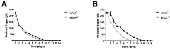 Daily residual sugar levels (g/L ± SEM) of controlled fermentations conducted by different yeast strains (n = 4 per treatment). Fermentations were conducted in the presence of either (A) 0 mg/L SO2 or (B) 50 mg/L SO2. Treatments with different superscript letters indicate significantly different fermentation progressions (2-factor repeated measures ANOVA, α = 0.05).
