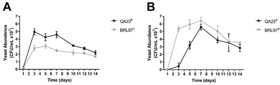 Samples for yeast abundance (CFU/mL) were taken on days 1, 3, 5, 7, 10, 12, and 14. Samples were serially diluted and plated using an automated spiral plater (Don Whitley Scientific Ltd., Bingley, UK) before being incubated for 48 h at 28–30 °C. After incubation, yeast colonies were counted using ProtoCOL 3 (Synbiosis©, Cambridge, UK), an automated colony counting and zone measuring software program.