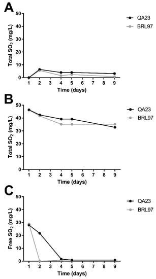 While total SO2 is useful for confirming SO2 addition levels and for monitoring SO2 production by yeasts, free SO2 is more useful for evaluating antimicrobial activity. Free SO2 is the portion of total SO2 that is available to act as an antimicrobial agent, and molecular SO2, which has the most antimicrobial activity, can be calculated from the concentration of free SO2 and the pH of the juice [,]. In the 50 mg/L SO2 treatments, approximately 28 mg/L of the SO2 added was present in its free form on Day 1 (Figure 3C). The pH of the juice on Day 1 was 3.16, and molecular SO2 was calculated to be ~1.2 mg/L in these fermentations. Free SO2 represented approximately 60% of the total SO2 concentration on Day 1. By Day 2, the fermentations inoculated with BRL97 did not contain any free SO2, but the fermentations inoculated with QA23 still contained approximately 21 mg/L. By Day 4, free SO2 had decreased to ~0 mg/L for both treatments and remained at this concentration until the end of the experiment. Free SO2 was not produced by either strain in the control (0 mg/L SO2) treatment.